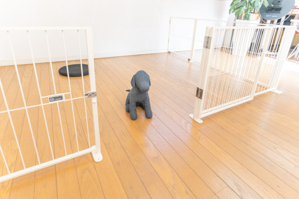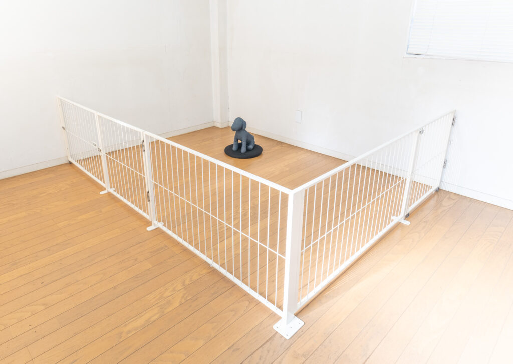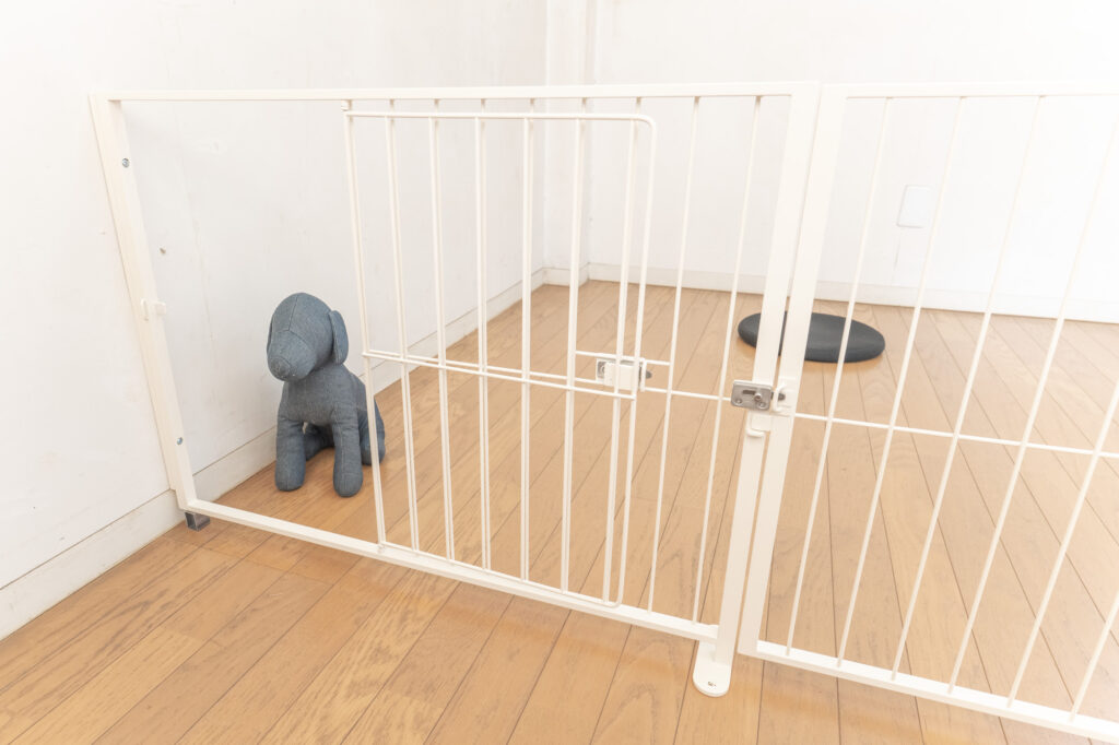 リビング横に設けた 約 幅3メートル×奥行1.8メートルのスキップフロア上を、ペットスペースにするための L字型のゲートです。