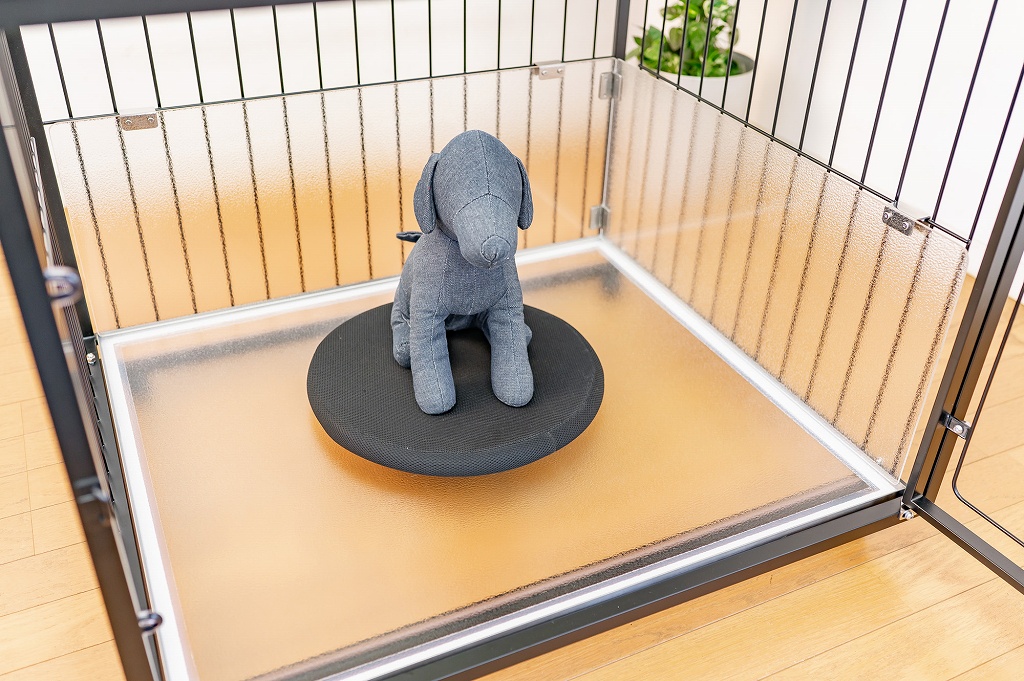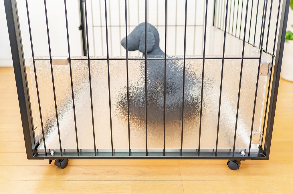 改めてトイレトレーニング中のワンコさんのために、トイレスペースとなる右側には半透明アクリル板で作ったカバーをセット。カバーにかかったおしっこ等は、アクリル板を伝って 底板の中に落ちるので、ケージ外への飛び散りを防ぎます。足上げワンコさんにおススメのカバーです。